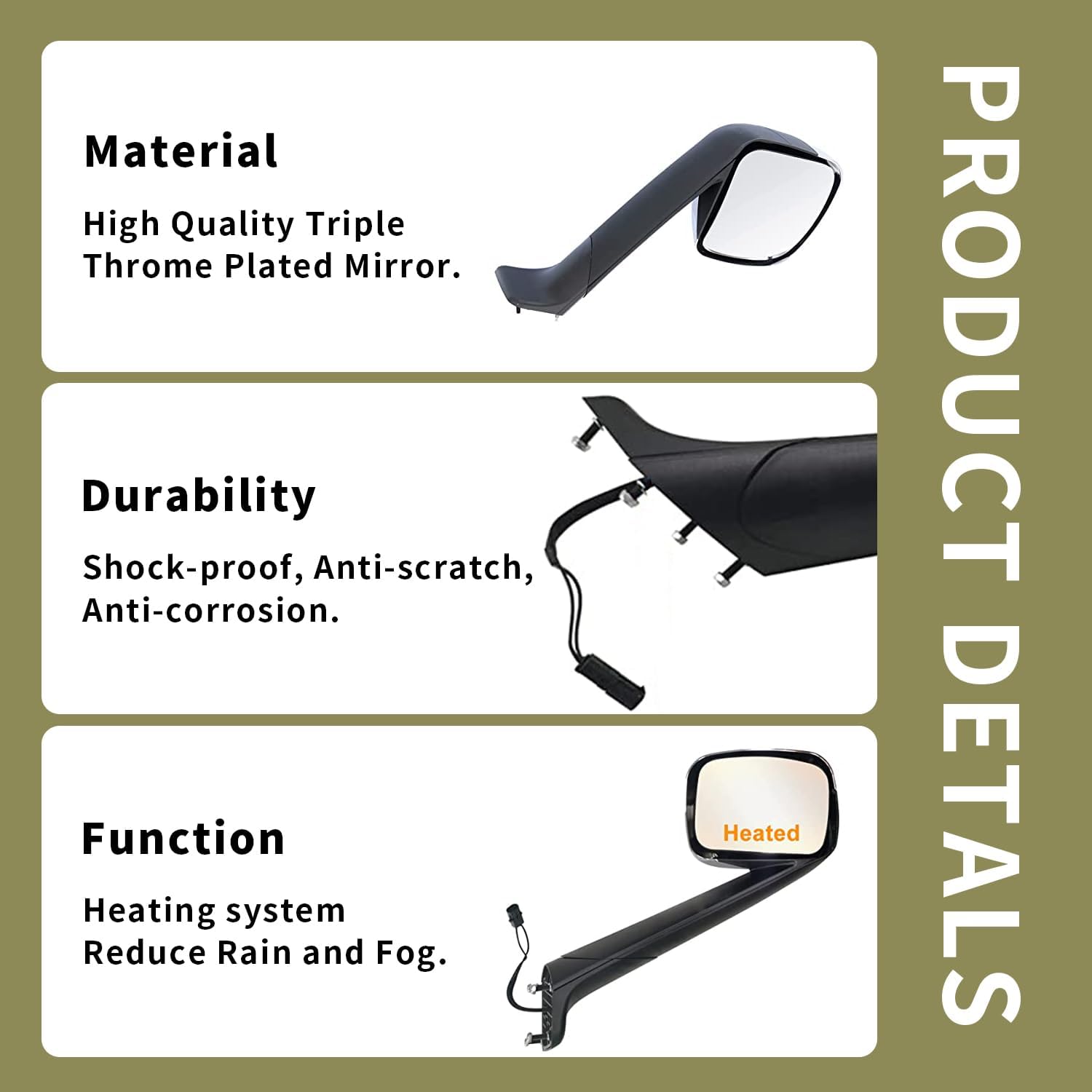 About this item 【Applicable Models】Fit for 2018 2019 2020 2021 freightliner cascadia hood mirror Left/Driver Side. 【Heating Material】Our freightliner cascadia mirror has a heating system can reduce rain and fog, making driving safer.Our new freightliner cascadia hood mirror is made of ABS material, shock-proof, scratch-proof, anti-scratch and anti-corrosion. 【Function】The Freightliner cascadia hood mirrors assembly provide the driver with greater visibility to enhance the driving experience and ensure driving safety. 【Installation】Freightliner Cascadia accessories are easy to install, flexible and convenient. 【After-sale Service】 If you have any problems after purchasing our products, our after-sales service team will help you solve them in time.